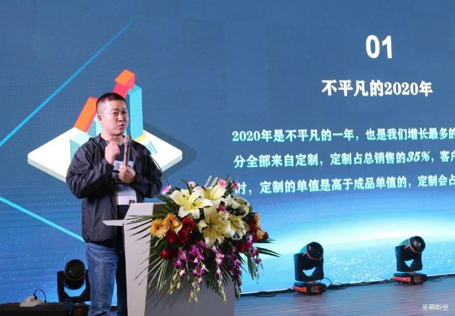 华灯璀璨的开场仪式,点燃了现场如火如荼的气氛。公海jcjc5500集团集团营销总经理陈玉伟先生对晚会进行了主题发言,他对2020年的营销工作进行了总结,并着重从营销工作部署、重点项目开展、产品整合、拎包帮扶、渠道运营和移动+定制整装优势等方面对2021年的营销工作做了全面的统筹规划。同时,他还讲解了“美国梦凯莎床垫”新品的产品工艺、市场优势、产品定位,使经销商对我们的新产品拥有更深入的认识和了解。